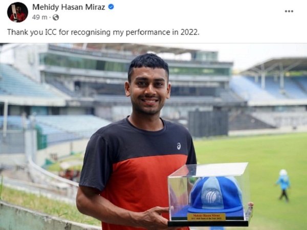 সোমবার (২২ মে) নিজের সামাজিক যোগাযোগমাধ্যম ফেসবুক পেইজে একটি ছবি প্রকাশ করে এই তথ্য নিজেই জানিয়েছেন মিরাজ। ক্যাপশনে তিনি লেখেন, ‘২০২২ সালে আমার পারফরম্যান্সকে স্বীকৃতি দেওয়ার জন্য আইসিসিকে ধন্যবাদ’।