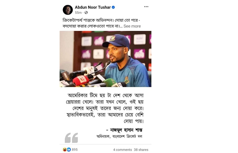 “আমেরিকার টিমে ছয়টা দেশ থেকে আসা প্লেয়াররা খেলেন। তারা যখন খেলে ছয় দেশের মানুষই তাদের জন্য দোয়া করেন। স্বাভাবিকভাবেই, তারা আমাদের থেকে বেশি দোয়া পায়”—বাংলাদেশ অধিনায়ক নাজমুল হোসেন শান্তর মন্তব্য দাবি করে এমন একটি ফটোকার্ড এরই মধ্যে সোশ্যাল মিডিয়ায় ভাইরাল হয়ে গেছে।