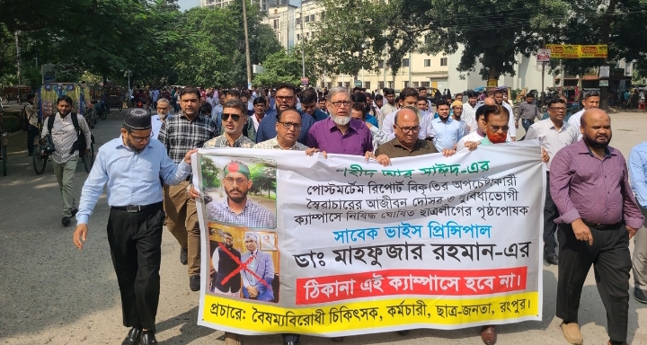 ডা. হোসেন আরও বলেন, দুই হাজার শহীদ ও ৩০ হাজার ছাত্র-জনতার রক্তের বিনিময়ে অর্জিত নতুন বাংলাদেশে ফ্যাসিবাদী ডা. মাহফুজকে কোনোভাবেই রংপুর মেডিকেল কলেজ ও হাসপাতালের প্রধান ব্যক্তি হিসেবে মানবে না কেউ। যারা এটাকে এখনো জিইয়ে রেখেছেন। তাদের বিরুদ্ধেও ব্যবস্থা নিতে হবে। তা নাহলে আন্দোলন অব্যাহত থাকবে। এর দায় দায়িত্ব নিতে হবে সরকারকে।